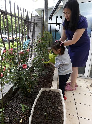 上海市闵行区居民倪欢在家中阳台上教小朋友使用自家厨余垃圾发酵出的花肥施肥(5月10日摄)k8凯发官方网站★★。倪欢还在自家阳台上安装薄膜光伏发电站★★、太阳能电灯★★、太阳能灭蚊灯等多种环保设施★★。新华社记者 丁汀 摄