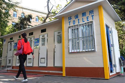 市民从吉林长春街头一新型免费环保公厕前经过(9月12日摄)★★。这种新型环保公厕采用太阳能供电★★,发泡式冲水★★,有节水蓄水功能★★。新华社记者 林宏 摄