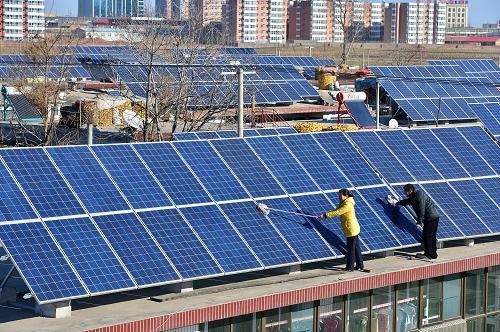 河北石家庄市平山县北东黄泥村两名村民在擦拭房顶上的光伏设备(12月16日摄)★★。所发电通过逆变器转换为交流电★★,全额输出并入国家电网皮皮网络电视k8凯发官方网站★★,既有效利用了太阳能源★★,也为村民带来了一定的经济效益皮皮网络电视k8凯发官方网站★★。新华社发(张震 摄)