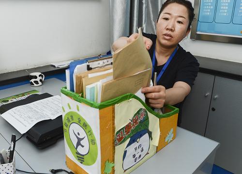 新疆乌鲁木齐市天山区社区工作人员邵丽平在办公★★,她使用的文件框是她利用废旧牛奶纸箱改造的(6月12日摄)★★。“变废为宝皮皮网络电视★★、DIY办公用品”不仅节约了办公成本★★,也让低碳生活理念深入人心★★。新华社记者 王菲 摄